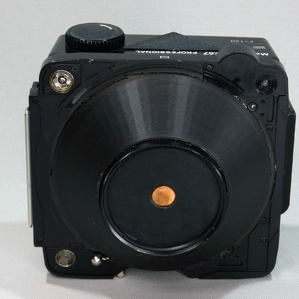 マミヤのRZ67のフィルムバッグに3Dプリンタで作成した鏡筒を接着して焦点距離を25mmとしました。。