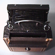 持ち運びに便利な4×5インチのズーム機能が付いたピンホールカメラを作成しました。蛇腹の先にあるボード(ピンホールの付いている)が水平に押し出されるように両脇に金属製の装置を付けました。 |